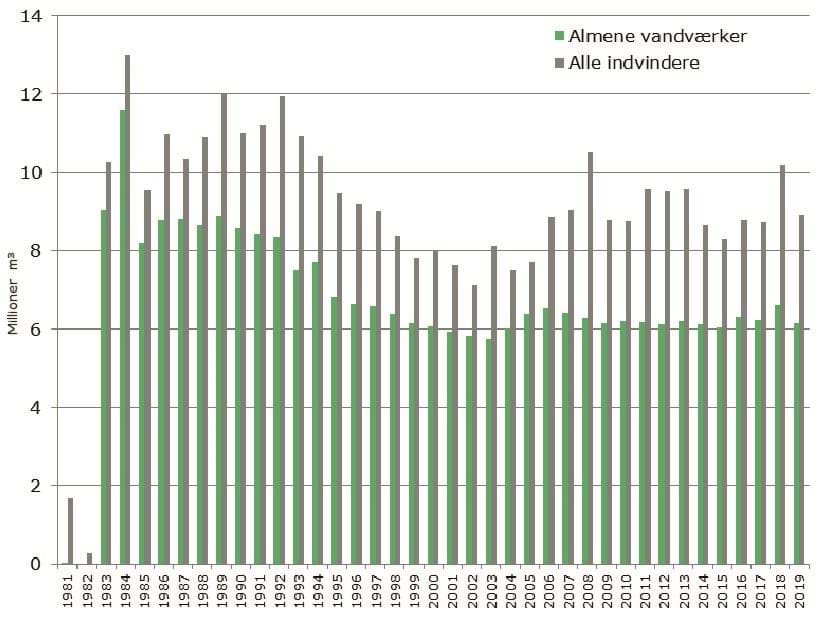 Det fremgår af Figur 1, at den samlede indvinding de sidste 10 år har ligget på omkring 8-10 mio. m3 om året, mens indvindingen på vandværkerne i den samme periode har stabiliseret sig ved ca. 6,2 mio. m3. Der er tidligere indvundet større vandmængder i kommunen, i omegnen af 12 mio. m³ i starten af 90’erne. Helt overordnet vurderes det, at vandværkerne samlet set, fortsat har en tilstrækkelig indvindings- og behandlingskapacitet. På nogle af vandværkerne vil der dog blive behov for at øge vandindvindingen, ligesom der over tid, også kan blive behov for at tilpasse vandværkets indvindingskapacitet ved udbygning med flere indvindingsboringer samt tilpasse vandværkets behandlings og udpumpningskapacitet.