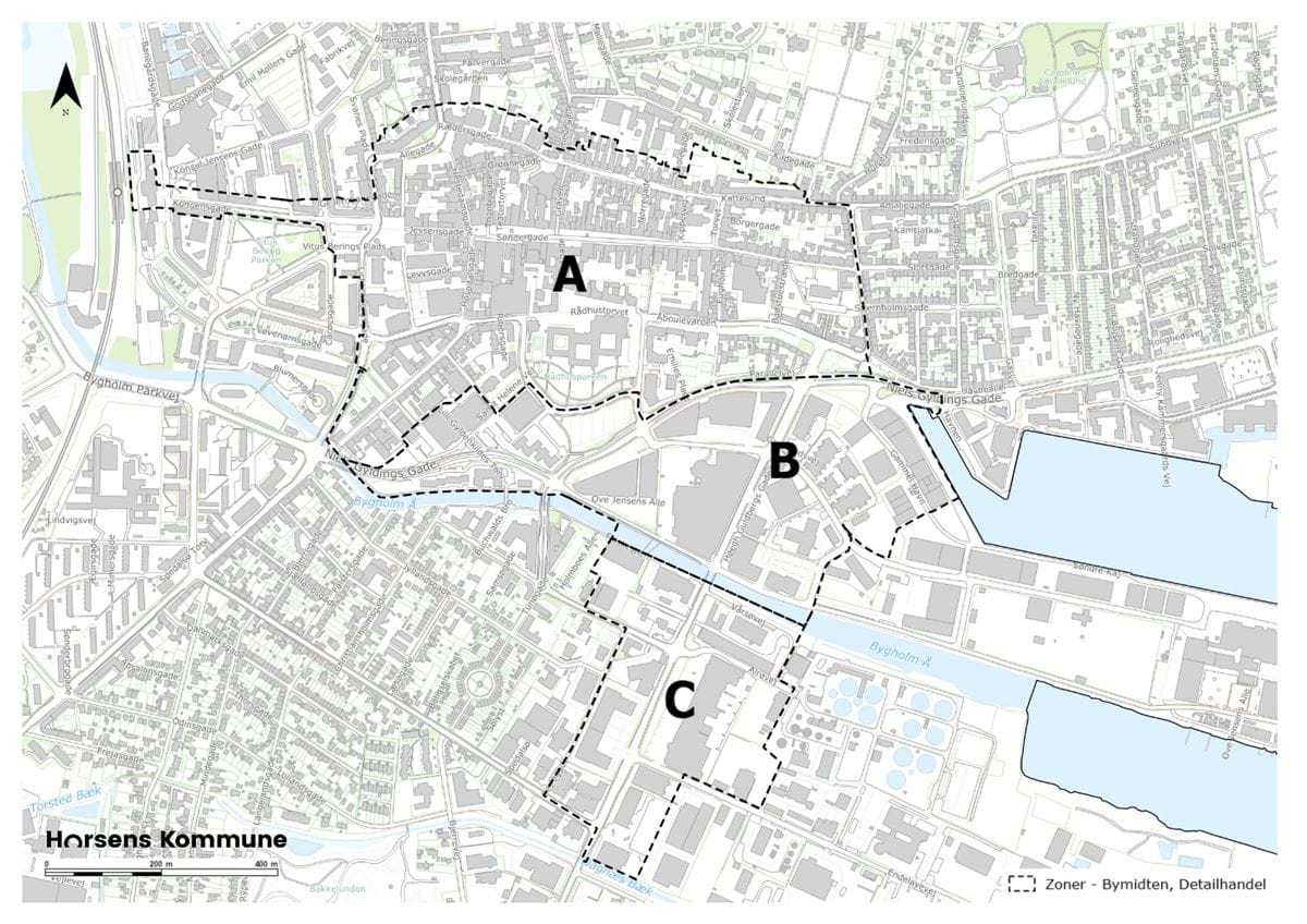 - Horsens bymidte opdeles i tre zoner, hhv. Horsens bymidte A, B og C.