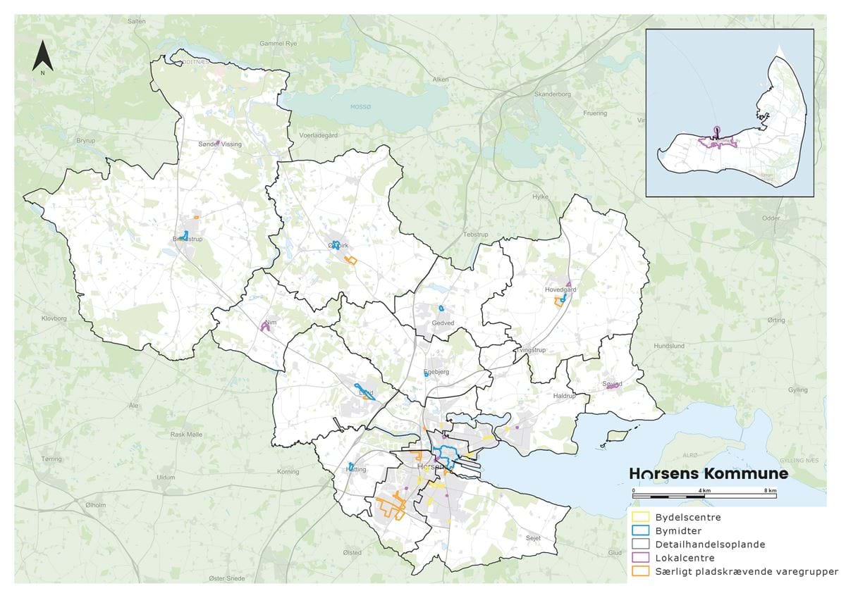 - Områder til særligt pladskrævende varegrupper: Høegh Guldbergs Gade, Horsens Syd, Erhvervsbyvej, Fuglevangsvej, Strandkærvej / Ormhøjgårdsvej, Silkeborgvej, Vestervangen, Virkefeltet, Lund syd-øst, Ørridslevvej og Sattrupvej.
