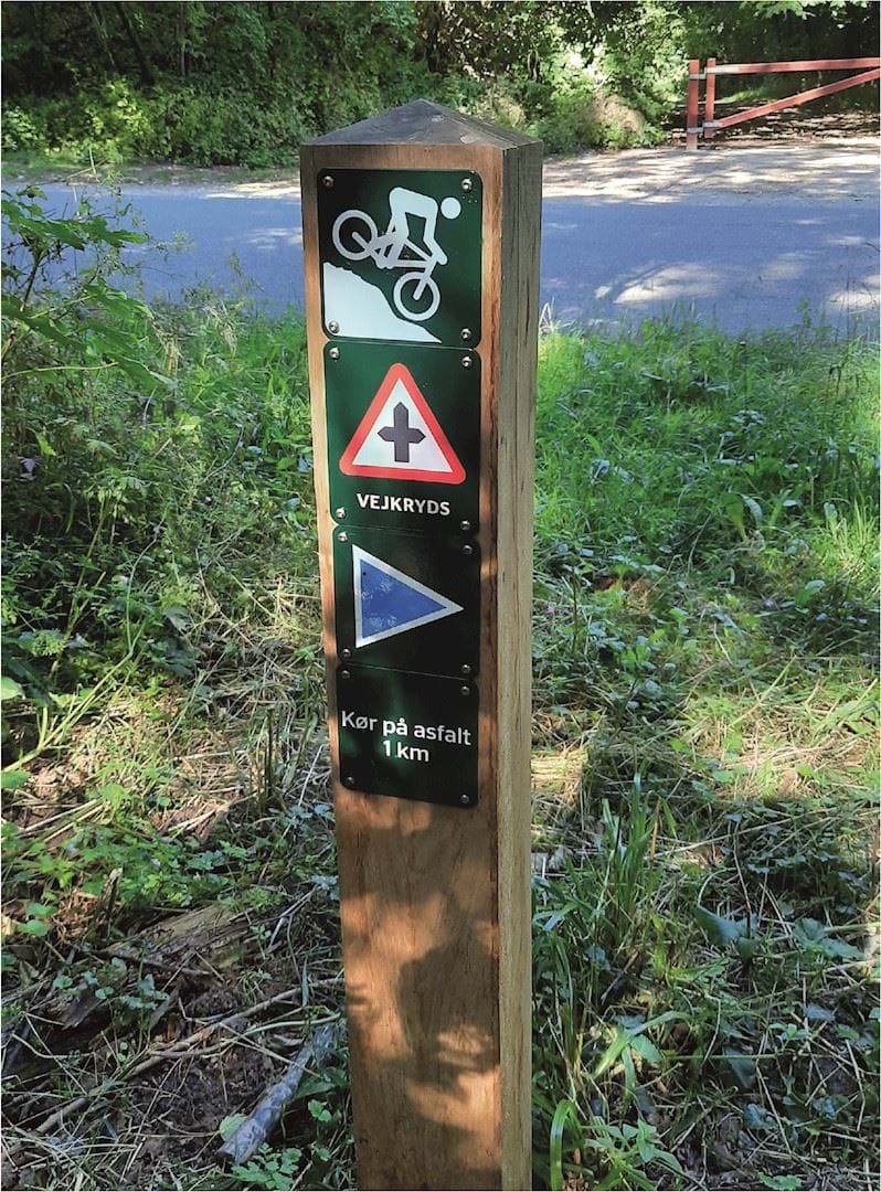 Billedet viser en markering af en MTB-rute ved Bygholm Sø.