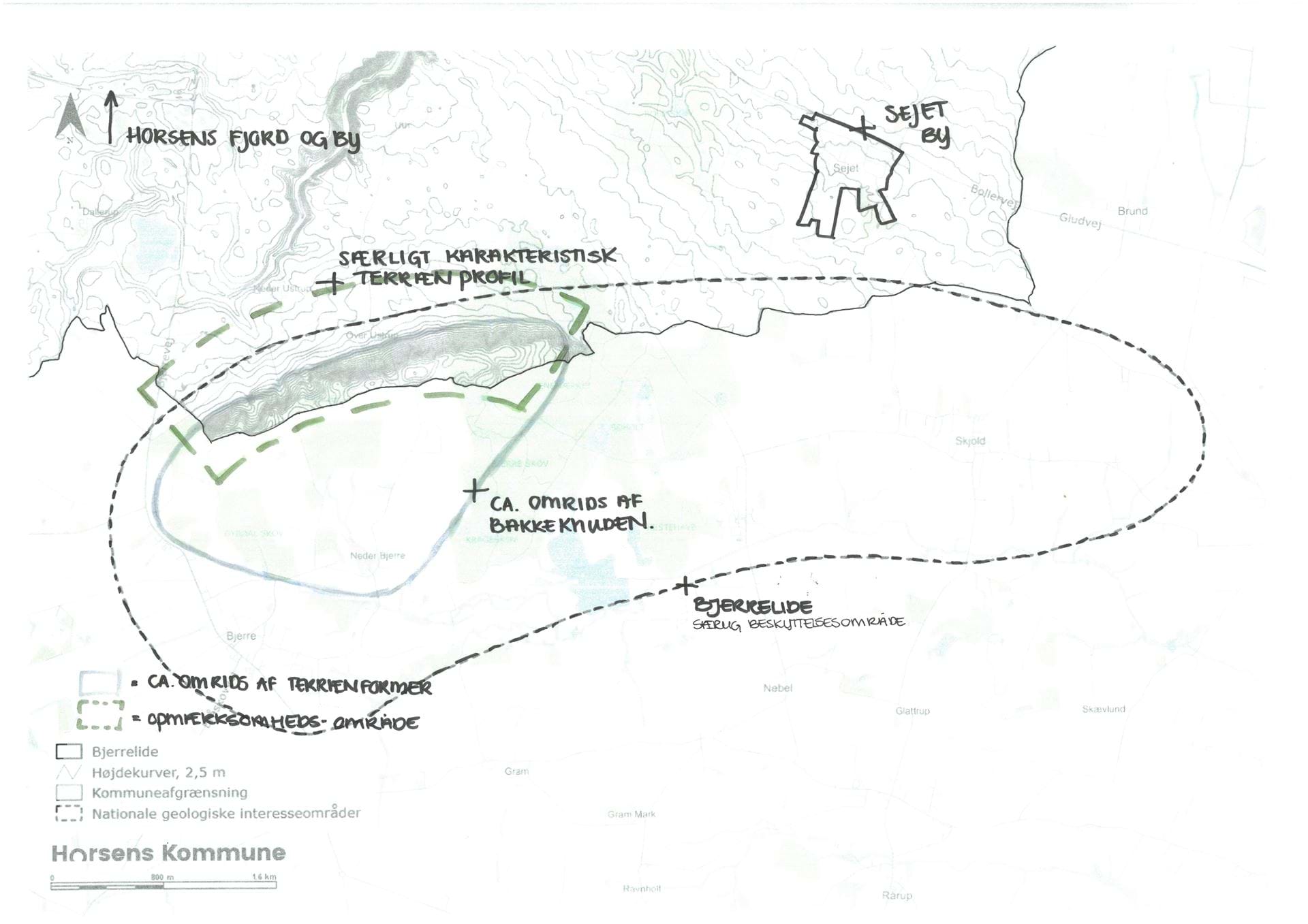 Billedet viser et analysekort over det geologiske interesseområde "Bjerrelide". På kortet er områdets afgrænsning vist, samt en cirka angivelse af bakkedraget og den karaktergivende, nordlige skrænt.