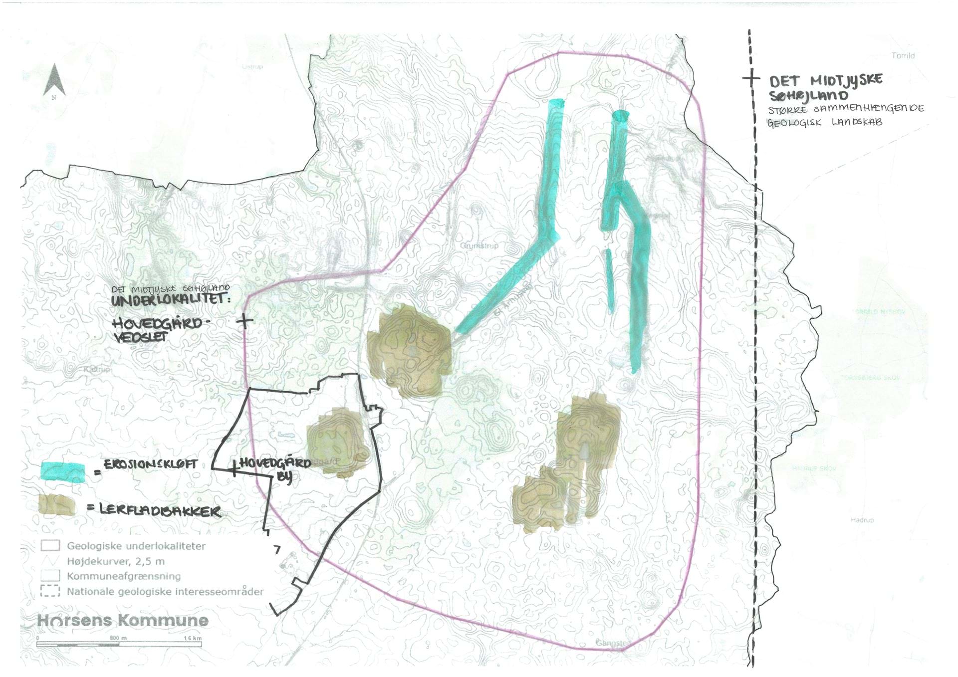 Billedet viser at analysekort over lokaliteten "Hovedgård/Vedslet". På kortet er lokalitetens afgrænsning vist, samt interessante lerfladbakker og erosionskløfter.