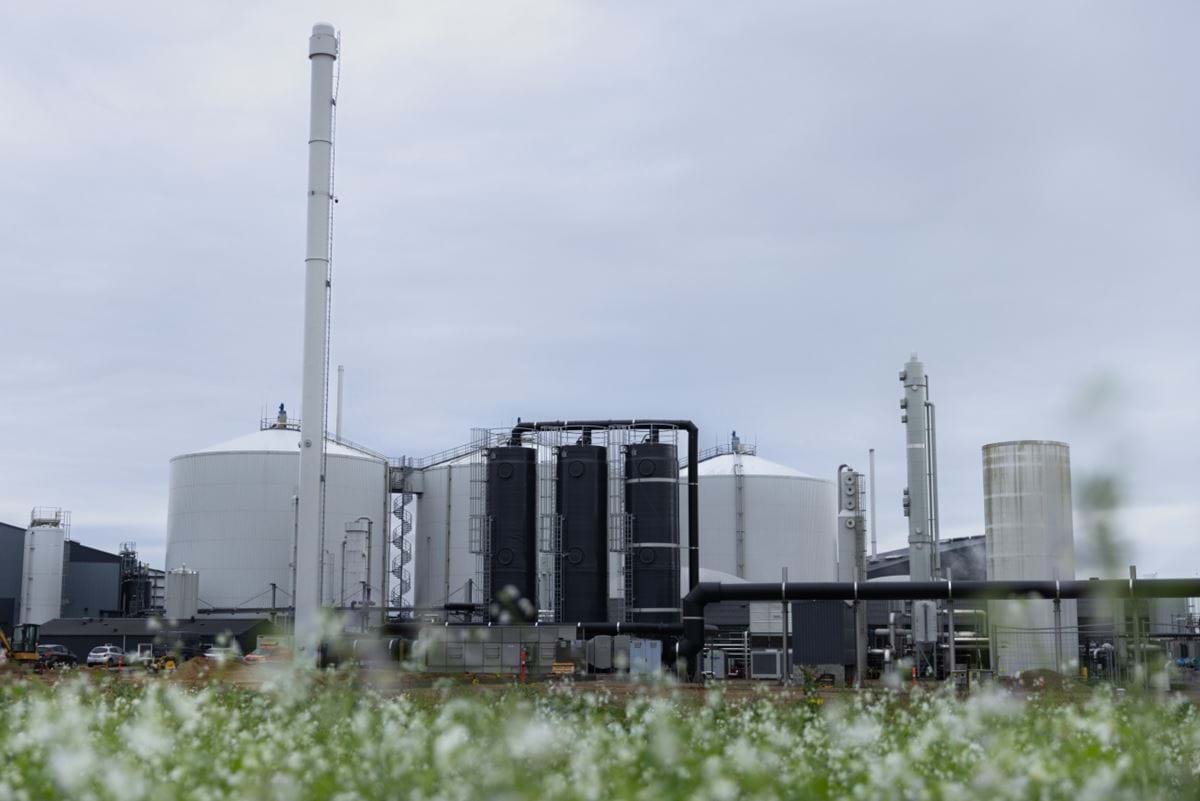 I baggrunden ses store, hvide reaktortanke.